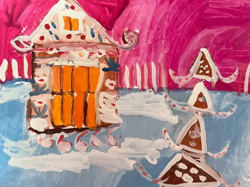 На рисунке изображена новогодняя ярмарка около Красной площади. Я там был со своими бабушкой и дедушкой. Мы пили там чай с вкусными булочками и пирожками.