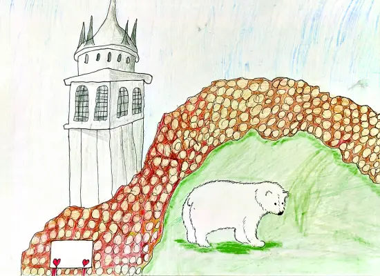 Вдалеке, словно игрушечная, виднеется узнаваемая башня у входа – символ зоопарка. А первое, что бросается в глаза - белый, милый мишка.