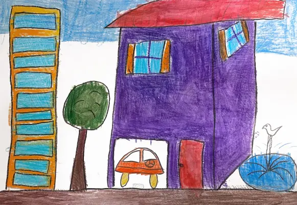 Солнечное утро, хорошая погода. Улица с двумя яркими домами, с небольшим фонтаном рядом, и гаражом с машиной. Я давно мечтаю о новом просторном доме, на подобие таун хауса для всей нашей семьи. У меня 2 сестренки и мама с папой, всего 5 человек. В этом доме будет комната для каждого, просторная гостиная и обязательно гараж для нашей машины. Ведь мы часто любим путешествовать.