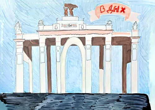 Ещё одно любимое место Москвы и район, который стал родным! На рисунке главный вход ВДНХ. Изображение главного входа в ВДНХ – места, куда мы всей семьёй отправляемся в выходные, любимое место, величественный вход в уголок развлечений.