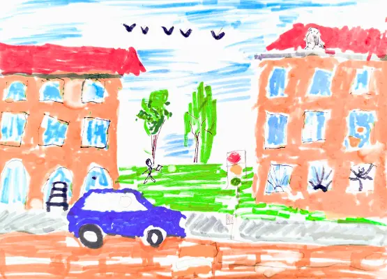 В нашем района есть очень хороший парк. Когда хорошая погода, мы всей семьёй ходим гулять в парк. Я нарисовал улицу, по которой мы ходим в парк. У нас очень хороший район.