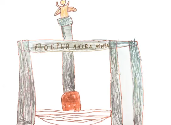 Добрый ангел мира изображён с распростёртыми крыльями, излучающими мягкий свет. В руках он держит оливковую ветвь — символ мира, а его умиротворённый взгляд устремлён вдаль. Образ олицетворяет гармонию, защиту и надежду, напоминая о важности добра и единства в нашем мире