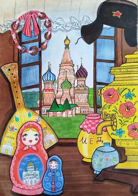 Картина приглашает зрителя окунуться в атмосферу русской старины и настоящего колорита страны. На переднем плане изображён вид Кремля — сердца Москвы, символа мощи и величия государства. Золотые купола церквей сверкают в лучах солнца, отражаясь в глади реки, словно переливающаяся драгоценность. Присутствует и народное творчество, которое гармонично вписывается в общий сюжет полотна. Рядом с Кремлём расположились традиционные русские изделия: яркие расписные матрёшки, золотой самовар, балалайка и шапка-ушанка.