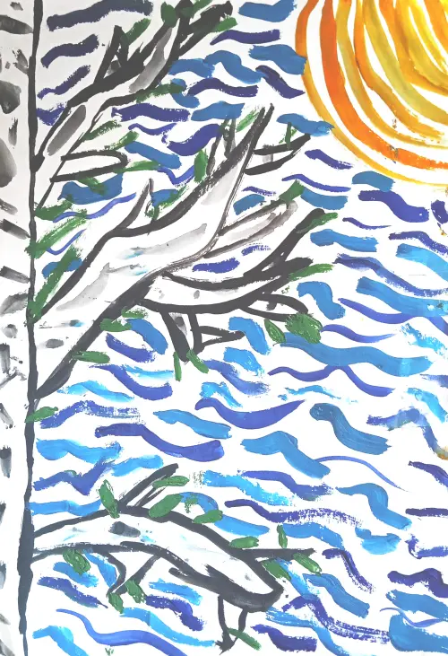 На данном рисунке я отобразила всю красоту Филёвского парка. А именно - многочисленные деревья в лице одного дерева, голубое небо, которое переходит в воду и яркое солнышко! Гуляя по нашему замечательному парку, мы всё это видим и радуемся тому, что такая красота нас окружает!