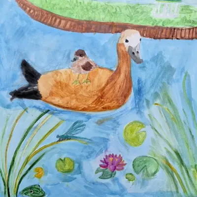 В парке «Яуза» много голубых стрекоз. На солнце их крылья очень красиво переливаются. Меня привлекла их красота, и мне захотелось нарисовать их рядом с уточками.