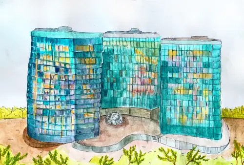 Бизнес-центр «Лотос» находится недалеко от моего дома. Я считаю, что это очень красивое здание. «Лотос» особенно красив на закате, когда лучи солнца отражаются в его стеклах. Именно поэтому я нарисовала его, ведь он ассоциируется с архитектурой будущего.