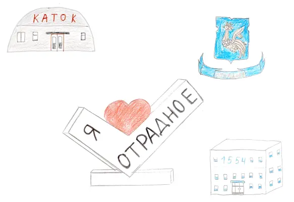 Я живу в Москве, в районе Отрадное. Хожу в садик №1554, занимаюсь в секции фигурного катания. Мне нравится мой район, он красивый и ухоженный. На рисунке изображен герб района, садик, куда хожу, а также каток, где занимаюсь фигурным катанием.