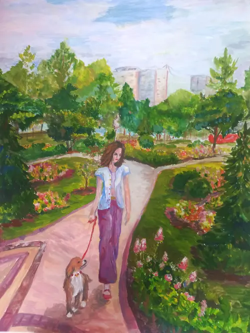 На картине изображена девушка. Она гуляет в парке возле метро «Отрадное» со своей собакой. Она приостановилась, чтобы получше разглядеть цветы возле дороги.