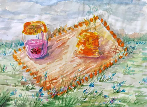 На картине изображён простой, но уютный утренний натюрморт, наполненный теплом и домашним умиротворением. Центральное место занимает прозрачный стакан с рубиновым компотом.