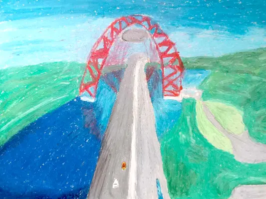 На рисунке я изобразила Живописный мост через Москву-реку. Это, наверное, самый яркий, заметный и известный символ нашего района. Я живу рядом с этим мостом и видела его в разное время года при разной погоде и освещении. Мне захотелось изобразить его именно летом: красная воздушная арка смотрится очень красиво на фоне синего неба. Я прохожу по этому мосту, когда мы идём всей семьёй в парк Сказка. Мне нравится проходить прямо под тарелкой, вблизи она гораздо больше, чем кажется издалека.