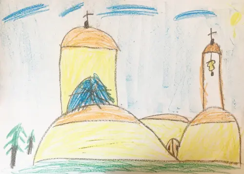 На рисунке изображён храм, который находится в Коптево. Он очень красивый. Там хорошо гулять в парке. И есть детская площадка. В нашем районе очень красивые здания и улицы.