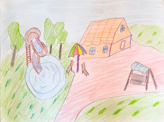 На этом рисунке я изобразил двор, о котором мечтаю я и, наверное, все мои друзья и сверстники. Я мечтаю о водяной горке на своей площадке и большом уютном домике, в котором мы бы с друзьями собирались и устраивали чаепитие.