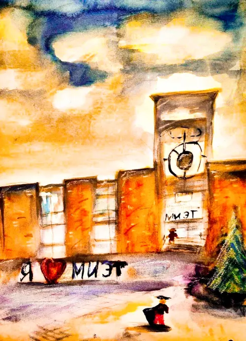 Когда с мамой и папой гуляли по городу, мы прошли мимо МИЭТа! Здание очень необычное по форме, и мы с учителем решили нарисовать это здание! Надеюсь, что победим!