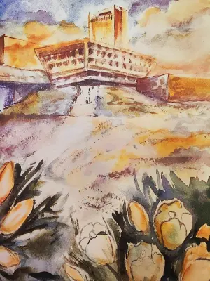 На занятиях с педагогом по рисованию рисовали любимое место в городе! Я даже и не думала, что есть еще любители такого же места, как и я! А назвала работу "Желтые тюльпаны", потому что именно они на первом плане.