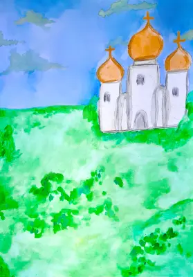 Этот рисунок прекрасно передает атмосферу умиротворения и спокойствия. Обратите внимание, как светло-голубое небо и пушистые облака сочетаются с зеленью поля, создавая контраст для центрального объекта — церкви с золотыми куполами. Такая композиция действительно делает церковь в центре поля главным акцентом, и дает ощущение тихой гармонии природы и архитектуры.