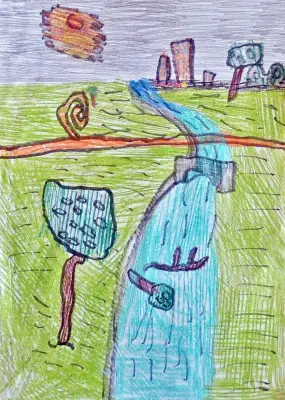 Этот рисунок передаёт любовь к родному району Тропарево-Никулино, показывая его зелень, уютные уголки и водоёмы. Наполнен теплотой и воспоминаниями. В этом районе в Олимпийской деревне я часто гулял с родными.