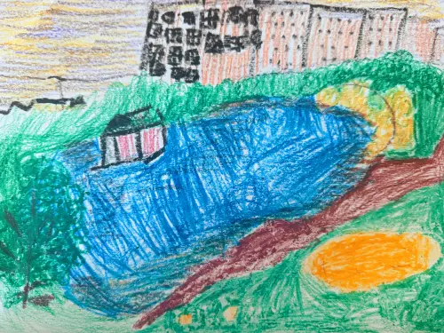 Рисунок "Олимпийские пруды" показывает безмятежные водоемы, возможно, в олимпийском парке. Это уголок спокойствия, где природа встречается с духом великих спортивных событий.