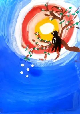 Это картина, наполненная спокойствием и естественной гармонией. Она может быть изображена в разных стилях. Жёлтая грудка ярко выделяется на фоне старой деревянной скамьи, оставшейся от прежних хозяев.