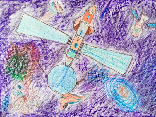 На рисунке изображён яркий космический корабль, который неожиданно приземлился во дворе обычного дома. Корабль выглядит фантастически: у него округлый корпус с блестящими металлическими панелями, разноцветные огоньки по бокам и большое иллюминаторное окно, через которое можно разглядеть инопланетного пилота или даже целую семью пришельцев.