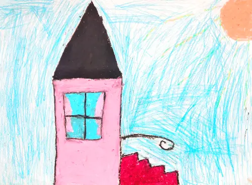 Рисунок выполнен цветными карандашами. Я нарисовала домик на детской площадке. Мы играем там в принцесс с моей сестрой. У нас красивый двор. Много интересных занятий.