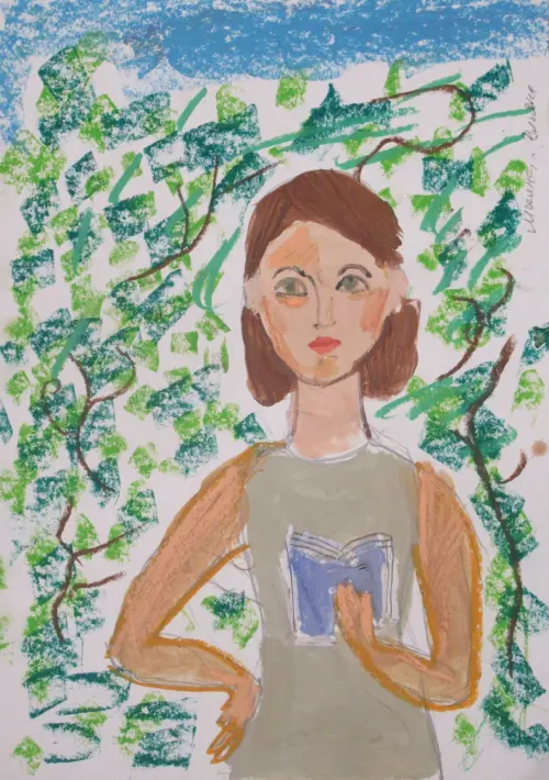 Весной в парке «Надежда» нашего района в тёплую погоду приятно посидеть с книжкой. Атмосфера цветущего сада придает чтению особое настроение. Я нарисовала девушку, которая открыла книгу и нашла в ней стихи о себе и о цветущих деревьях.