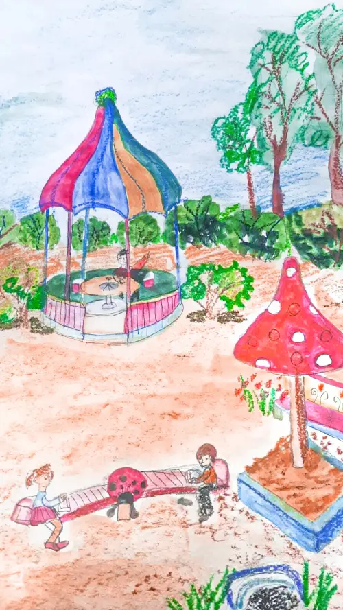 Я очень люблю свой район, поселок, двор и нашу детскую площадку. С друзьями мы ходим в Дом культуры, где рисуем. И когда нас попросили нарисовать любимое место в поселке, я нарисовал свою любимую детскую площадку.