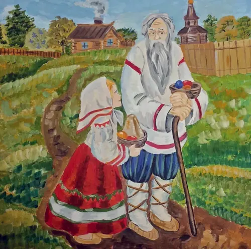 Солнце ласково освещает их лица, подчёркивая морщинки на лице деда и румянец на щеках девочки. В руках у них плетёные корзинки, наполненные крашеными яйцами, куличами и другими пасхальными угощениями. Вокруг царит атмосфера тепла, уюта и предвкушения светлого праздника.