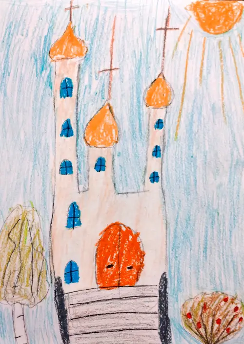 Мы с бабушкой ходим в храм Всемилостивого Спаса. Это красивый новый храм при въезде в наш район Митино. Там красивые росписи и иконы. Рисунок выполнен цветными карандашами.