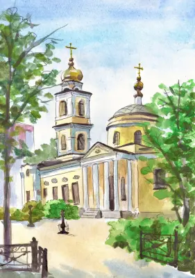Храм на Байкальской улице в солнечный день. Одно из любимейших мест в нашем районе. Рядом фонтан и цветущий сад. Техника-акварель и черная ручка. После того, как рисунок был раскрашен акварелью, возникла необходимость обвести детали по контуру для большей выразительности и четкости линий.