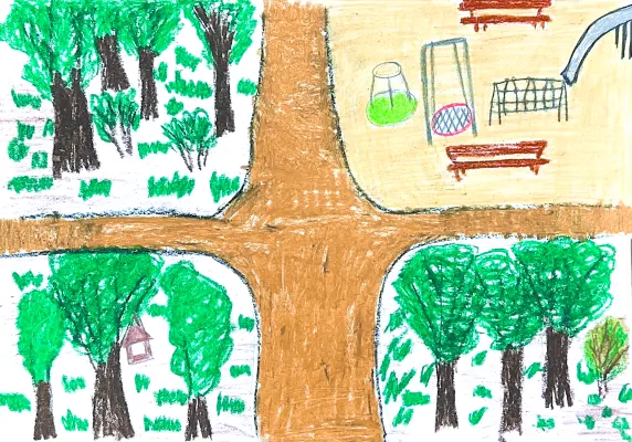 Из моего окна видна деревня Бибирево - это маленький парк. Здесь есть много разных площадок и дорожек. Я люблю кататься по дорожкам на самокате. Я с родителями часто хожу сюда гулять.