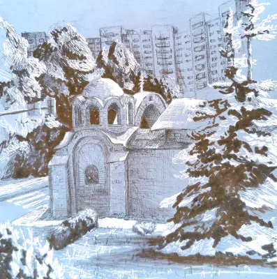 Работа выполнена в начале этого лета около Храма Покрова Пресвятой Богородицы в Ясенево. Зарисована часть ограждения храма. В работе использованы: простой карандаш, белая ручка, черные линер и маркер.