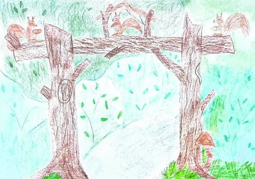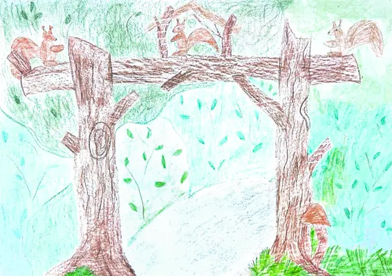 Я живу рядом с маленьким лесом. Мы часто гуляем, кормим белочек и катаемся по лесным дорожкам на велосипедах с мамой. Здесь много разных деревьев. Я люблю лес.