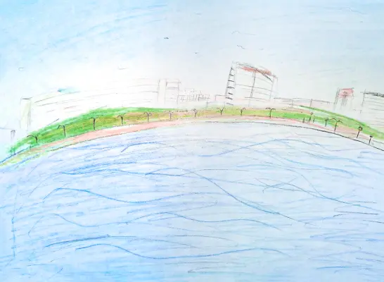 Я хожу в детский лагерь «Нептун» в Гольяново, и из нашего лагеря открывается вот такой вид на Гольяновский пруд: на берег, и на дома вдали. Мне очень нравится этот вид, поэтому решила его нарисовать.