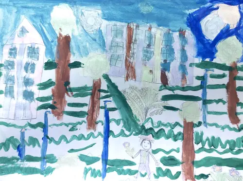 Эту работу мы делали совестно с моей сестрой, она очень любит рисовать. Мы нарисовали наш двор, школу, которая находится недалеко от нашего дома. Много зелени. Работа выполнена карандашами и красками.