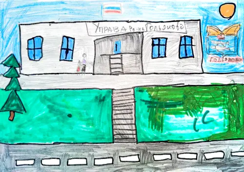 Я нарисовала управу района Гольяново, потому что это главное учреждение нашего района, над ней всегда развевается флаг нашей страны. Рядом нарисовала герб района Гольяново и солнце, чтобы оно всегда светила над нашими головами