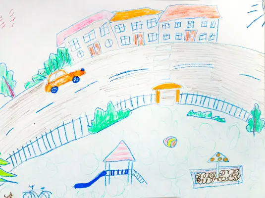 Алина нарисовала свой двор, в котором любит гулять. Двор находится недалеко от жилых многоквартирных домов, он очень уютный и зелёный. От проезжей части двор отделен изгородью, что делает его безопасным. Алина рассказала, что у неё много друзей, с которыми она познакомилась именно во дворе на прогулке. Работа выполнена цветными карандашами.