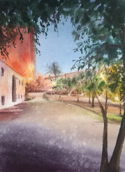 Летним вечером приятно прогуляться в нашем районе. Я нарисовала красивое освещённое место у нашей амбулатории. Мы любим с семьёй гулять по нашему району.