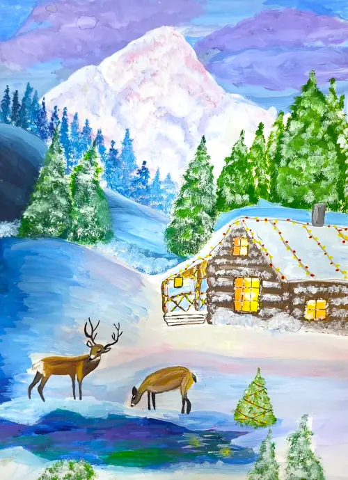 Виктория поделилась своими впечатлениями о том, как побывала в доме в горах, где проживает ее родственница. Очень красивое место, уникальная природа вокруг, совсем рядом пасутся олени. Работа выполнена гуашью.