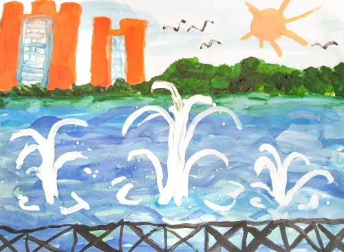 Вороновские пруды - это каскад из двух крупных прудов на реке Вороновка (приток реки Мочи) в Вороновском поселении. В центре главного пруда установлены фонтаны. В прудах водится рыба. Рисунок выполнен гуашью.