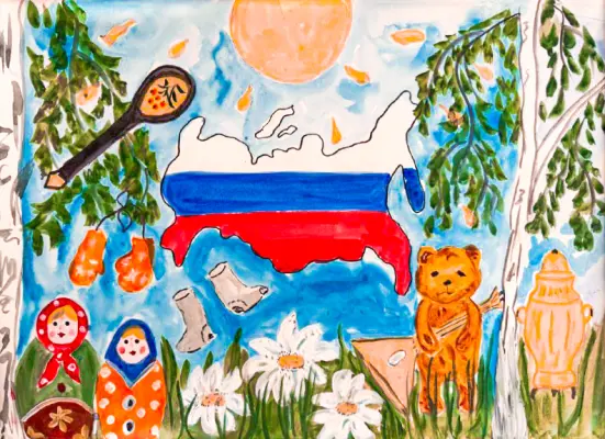 Главные элементы: 1. Берёзы– символ русской природы, с резными листьями и тонкими стволами. 2. Матрёшки, играющие в классики или сидящие на скамейке. 3. Наши друзья-животные, играющие на муз.инструментах. 4. Триколор (флаг России), развивающийся на фоне радости и мира.