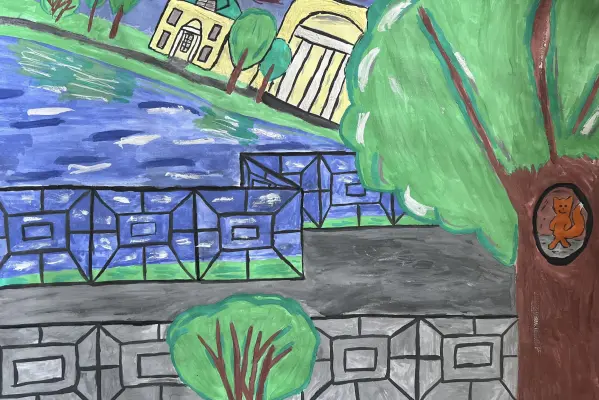 На картине запечатлен летний вечер в усадьбе Кузьминки, где природа и архитектура сливаются в гармонии. На заднем плане виднеется величественное здание усадьбы. Тёплый свет заката нежно окутывает конный двор, окружённый зеленью. В воздухе витает лёгкий аромат травы и цветов, а звуки природы создают симфонию умиротворения. Отражение в спокойной глади пруда добавляет глубину и магию в эту идиллию. С правой стороны, на дереве, уютно устроилась рыжая белочка, словно хранитель этого уголка тишины. Картина передаёт атмосферу уюта и гармонии, приглашая зрителя погрузиться в мир летних вечеров, полных мечтаний и вдохновения.