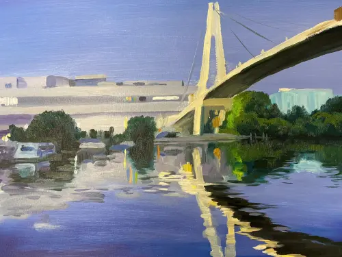 Самый красивый пешеходный мост через Москву-реку. Позволяет комфортно добираться жителям Красногорского района до станции метро «Мякинино». Специально ездил туда, чтоб написать эту картину.