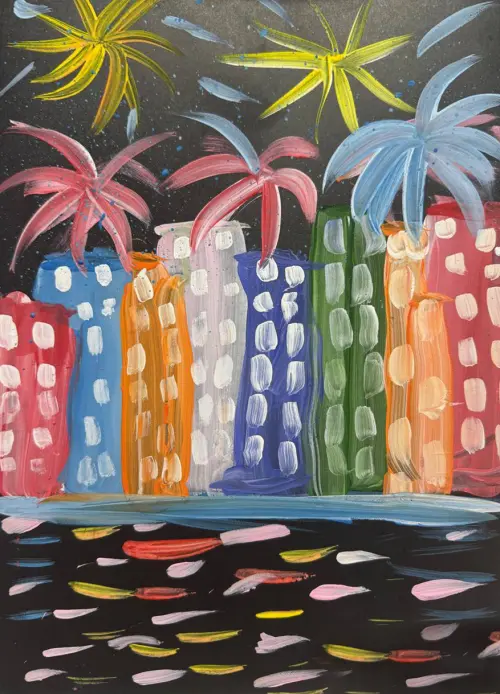 В своем рисунке я показала свои впечатления от праздника Победы. Когда вместе с родителями вышли во двор поздно вечером 9 мая и наблюдали за вечерними огнями праздничного салюта. Мы смотрели и восхищались тем, как красиво взлетают вверх огни салюта яркими нитями, превращаясь в разноцветные сверкающие россыпи. Я загадывала желания и мне очень хотелось, чтобы они сбылись.