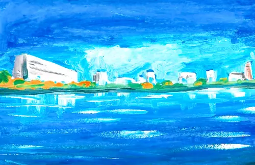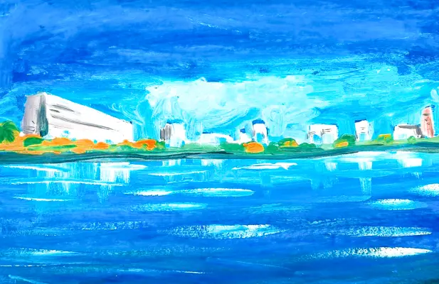 Я нарисовала Гольяновский пруд. Это очень красивое место, я люблю там гулять с мамой, с друзьями. Я люблю рисовать, моя работа выполнена гуашью. Я старалась передать, как блестит вода в пруду в солнечный день.