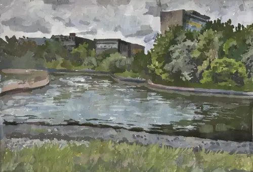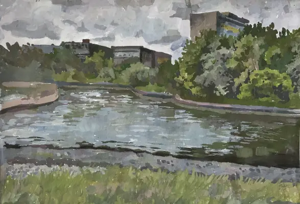 На живописной работе изображен вид со стороны Парка Победы на завод "Ангстрем". Завод работает еще с основания города Зеленоград. Его можно назвать одной из достопримечательностей города.