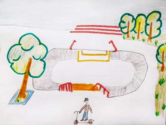 Это моё любимое место. Мне очень нравится приходить сюда с велосипедом или самокатом. В хорошую погоду я с друзьями с удовольствием катаюсь по горкам, учусь прыгать через препятствия. Мне нравится активно гулять в парке!