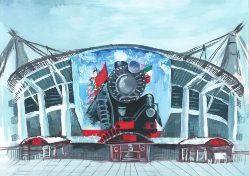 На рисунке изображена спортивная Арена, это бывший стадион Локомотив. Работа выполнена акварелью.
