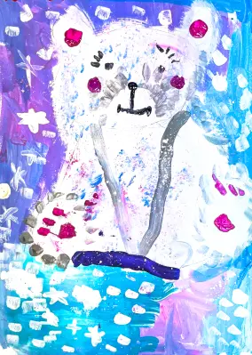 Я нарисовала белого мишку в снегу. Мне нравится, как снежинки блестят на солнце, а мишка такой добрый и весёлый. Я хотела нарисовать зиму и мороз, чтобы все видели, как это красиво. Мой мишка — самый лучший, он будет радовать всех своей улыбкой!