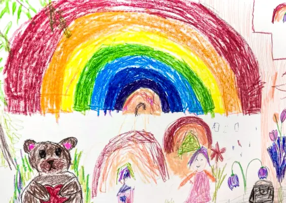 Я нарисовала яркую радугу, которая передает хорошее настроение и мир. В моем дворе гуляют мои друзья, мой любимый мишка "Гоша" и конечно же моя мама. Мы все вместе садим цветы. Этот рисунок не просто изображает место - он рассказывает историю, пробуждая в зрителе тёплые воспоминания о том, чего он, возможно, никогда не видел, но интуитивно узнаёт как что-то родное.