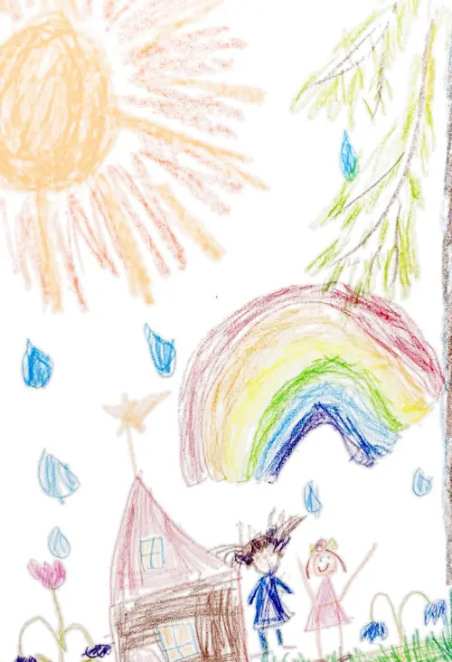 Мой солнечный дворик. Тёплая, уютная атмосфера летнего дня, наполненная светом и детской радостью. Цветовая гамма: Тёплая палитра: охристые, золотистые оттенки. Идея работы: Передать ощущение домашнего тепла и безмятежности, показать, как простые вещи становятся прекрасными под летним солнцем.